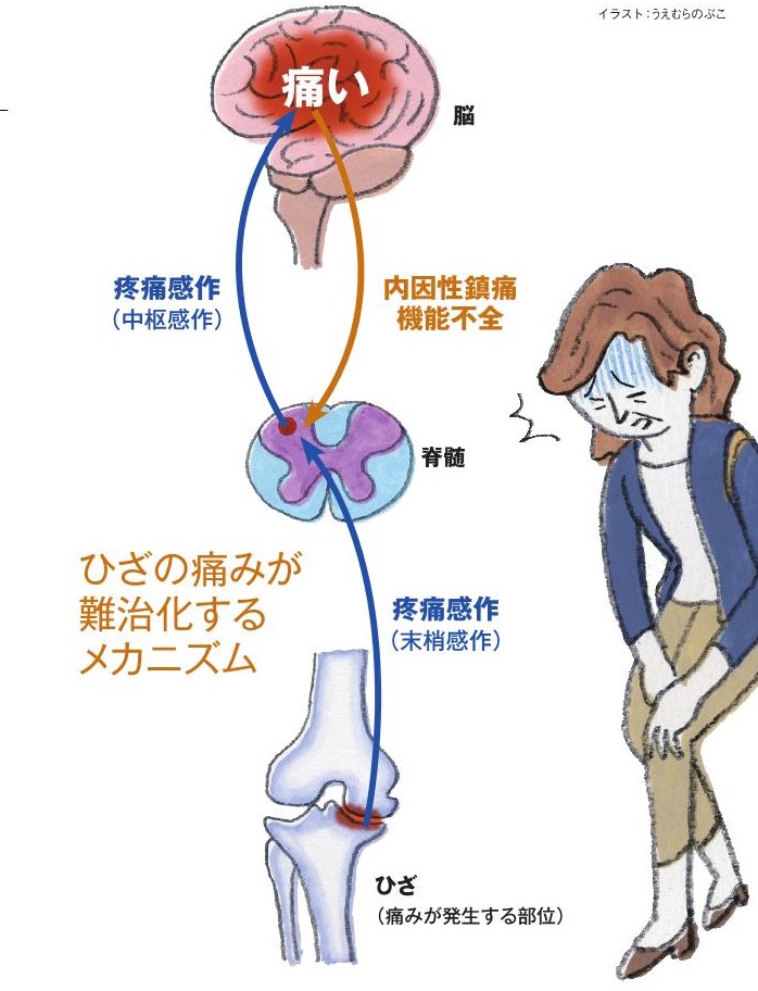 中高年になるとひざが痛むことは多く、その原因は主に変形性ひざ関節症です。変形性ひざ関節症は、軟骨がすり減り関節が変形してくる疾患です。日本では、50歳以上の2人に1人が変形性ひざ関節症を有すると推定されています。今後高齢化が進むにつれて、ますます患者数は増えていくことでしょう。さて、変形性ひざ関節症があるからといって必ずしも痛みを伴うわけではなく、痛くない変形性ひざ関節症も少なくありません。その理由は、軟骨に神経がないためであり、軟骨がすり減るだけでは痛みは生じません。痛みは骨や滑膜など神経が存在する部位で発生します。MRI検査で判明する滑膜の炎症や骨の異常が痛みと関連した病態であることが分かってきています。さらに、ひざの痛みが長引くと、痛覚に関わる神経系に変化がみられるようになります。痛み刺激を脳に伝える神経が敏感になる「疼痛感作」と、人間が本来もつ鎮痛機序の機能不全状態(内因性鎮痛機能不全)です。これらの「疼痛感作」と「内因性鎮痛機能不全」によってひざの痛みは難治化することが最近注目されています。