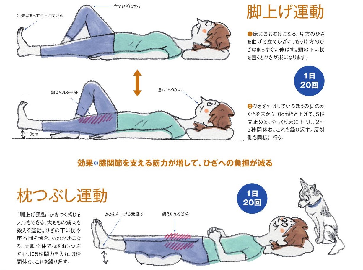 ひざの痛みがあると薬に頼りがちですが、運動には薬に劣らない鎮痛効果があることが分かってきました。また、運動は薬と違って副作用はなく、鎮痛効果だけではなく体力向上効果もあります。運動によって早い人だと数日で痛みは改善し、継続することによって「疼痛感作」や「内因性鎮痛機能不全」が改善し、痛みに強い体になります。ひざの痛みに対する運動として、①ひざの曲げ伸ばしを行うストレッチ ②ひざ周りの筋力訓練 ③散歩や水中ウォークなどの有酸素運動を組み合わせて行います。大切なことはできるだけ毎日継続して行うことです。最も基本となる筋力訓練はひざを伸ばす大腿四頭筋の筋力訓練で、1日最低20回程度行うのがよいでしょう。