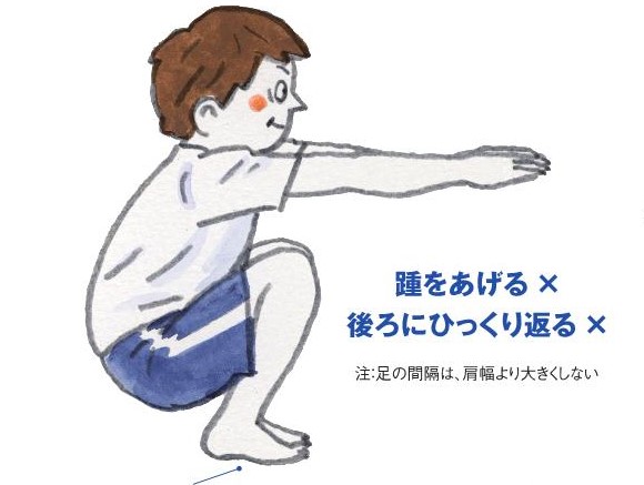 しかし、下肢の関節が柔らかくない場合には、無理をするとオスグッド病や足関節捻挫を起こすことが多くなります。また、運動時に良いパーフォーマンスをすることができなくなります。そこで、しゃがみ込みができない児童生徒に対しては、普段からストレッチングをしっかり行うように指導してください。その方法は運動器の健康・日本協会のHPの「ストレッチングの方法」をご参考ください。