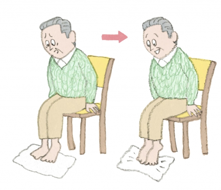 地面をしっかりつかむ足指の力と感覚を磨く。椅子に座り、足元に薄手のタオルを敷き、タオルの端に両足を置く。両足の指を広げてタオルをつかみ、足指を曲げてタオルを手前に引き寄せる。これを10回繰り返す。