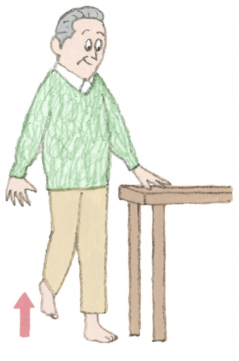 足の筋力を上げるエクササイズ。椅子に浅く腰かけて机に手を添え、5秒かけてゆっくり立ち上がり再び椅子に座る。これを10回繰り返す。1日2〜3回行う。