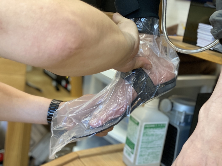 「我々の中敷きの考え方としては、足首とかかとの骨を正しい骨格に戻してあげる、というのが目的。型をとる際もそのあたりによりフォーカスしていて、指先あたりは自由に動くように作ります」