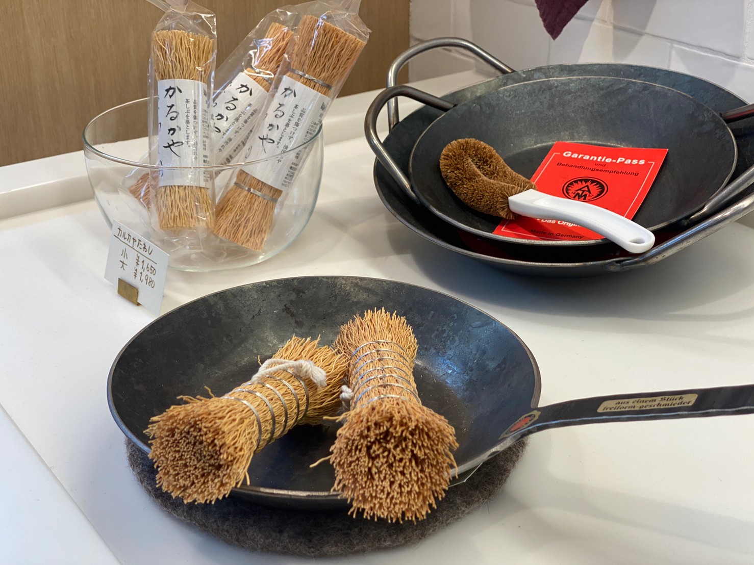 「例えば、たわしでこすると傷つきそうなイメージのあるグラスやホーロー製品も棕櫚のたわしで磨けますし、鉄のフライパンの汚れ落としにはホワイトパームのたわしが最適……というふうに、用途に合わせてたわしを選べば、かなり便利に幅広く使っていただけるんです」と早戸さん。つまりこの店はたわしの使い方や可能性を体感できるスポットでもあるわけですね。