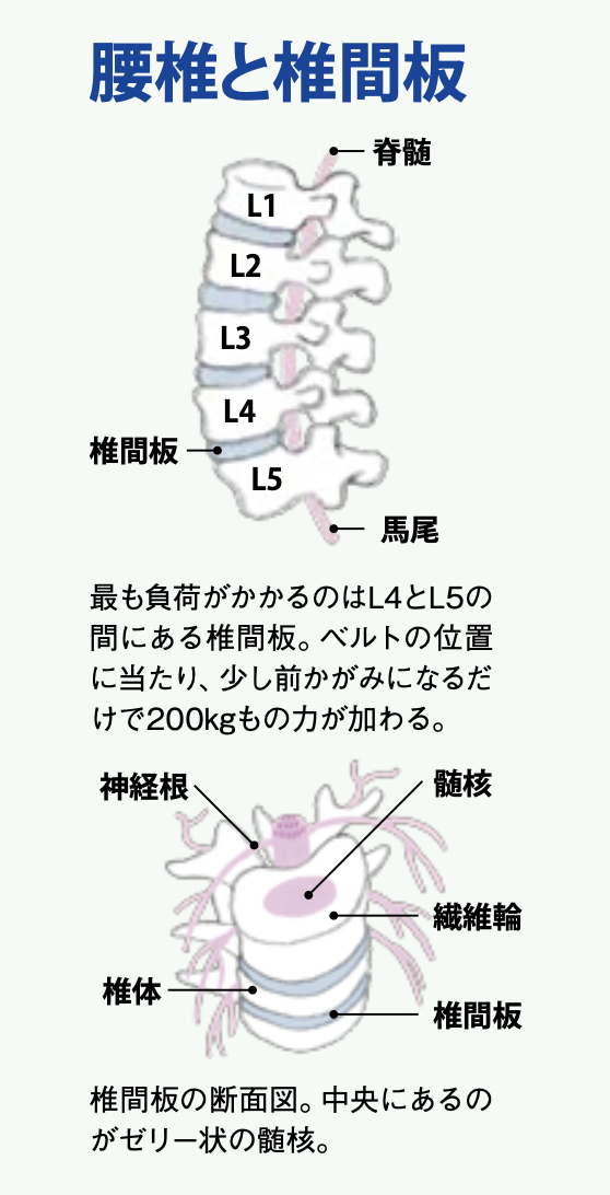 人はまっすぐな姿勢で立っている時、上半身の重みを下半身全体で支えています。しかし、前かがみの姿勢では、上半身の重量のほとんどを腰で支えることになります。これは腰椎の一部に負荷が集中し、椎間板が押しつぶされたように変形した状態です。このとき椎間板には、200kgが載っている負荷がかかっています。