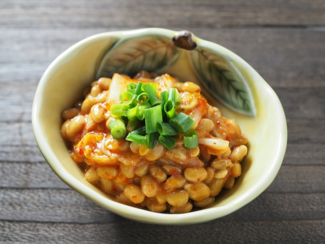骨は約三年のサイクルで新しくつくりかわるので、骨に必要な栄養素を摂ると、強い骨づくりに役立ちます。骨によい栄養素は、日光にあたると生成されるビタミンD、骨の基盤をつくるカルシウム・たんぱく質・ビタミンC、骨の目減りを防ぐビタミンKなどです。これらがバランスよく含まれているものといえば、答えは②で、納豆和えです。