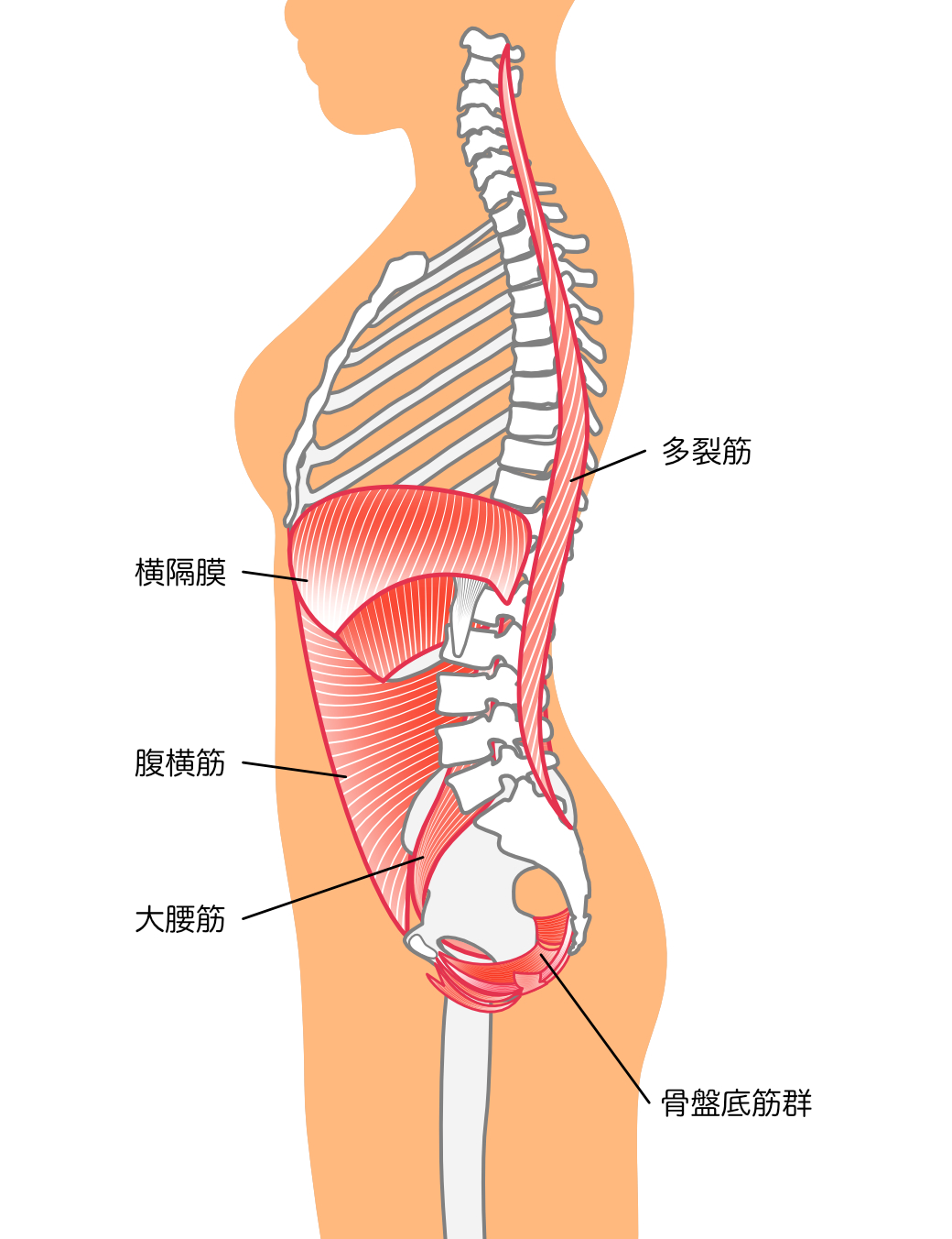 日傳先生によれば、腰痛を緩和させるためには、まずは最低限の筋力をつけることが大切とのこと。例えば、肋骨の下部、腹部や腰回りをぐるりと取り囲む筋肉(腹横筋・骨盤底筋・多裂筋・横隔膜など)を鍛えることで、腰の痛みを和らげることができるそうです。