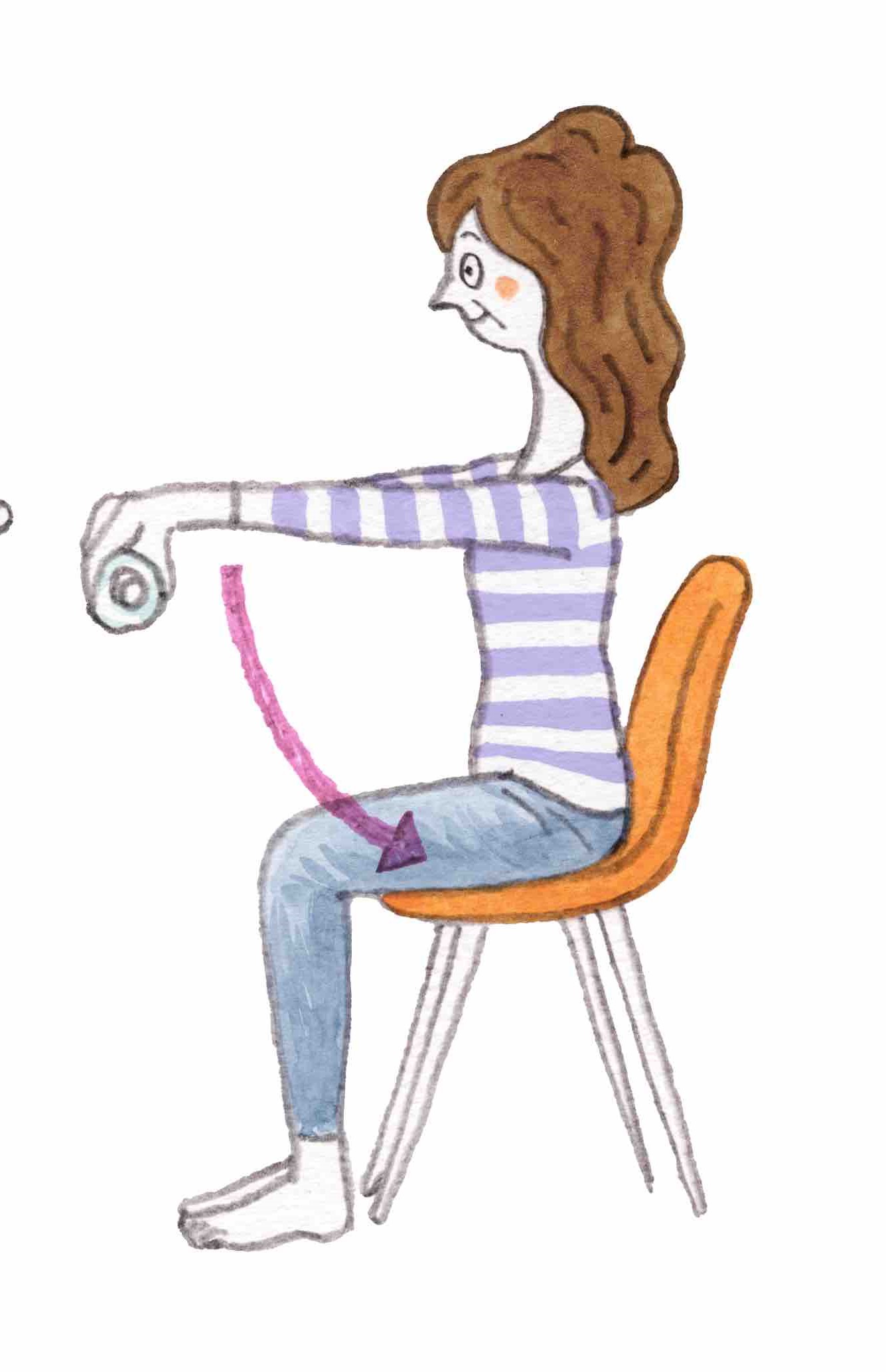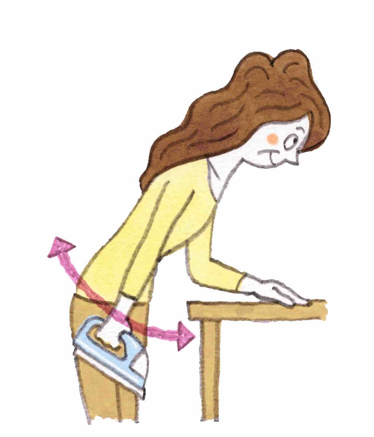 手に重り(アイロンや水を入れたやかんなど)を持ち、肩の力を抜いて、上体を傾けます。体全体で腕を振るようにして、前後左右、また円を描くようにゆっくりと動かします。
