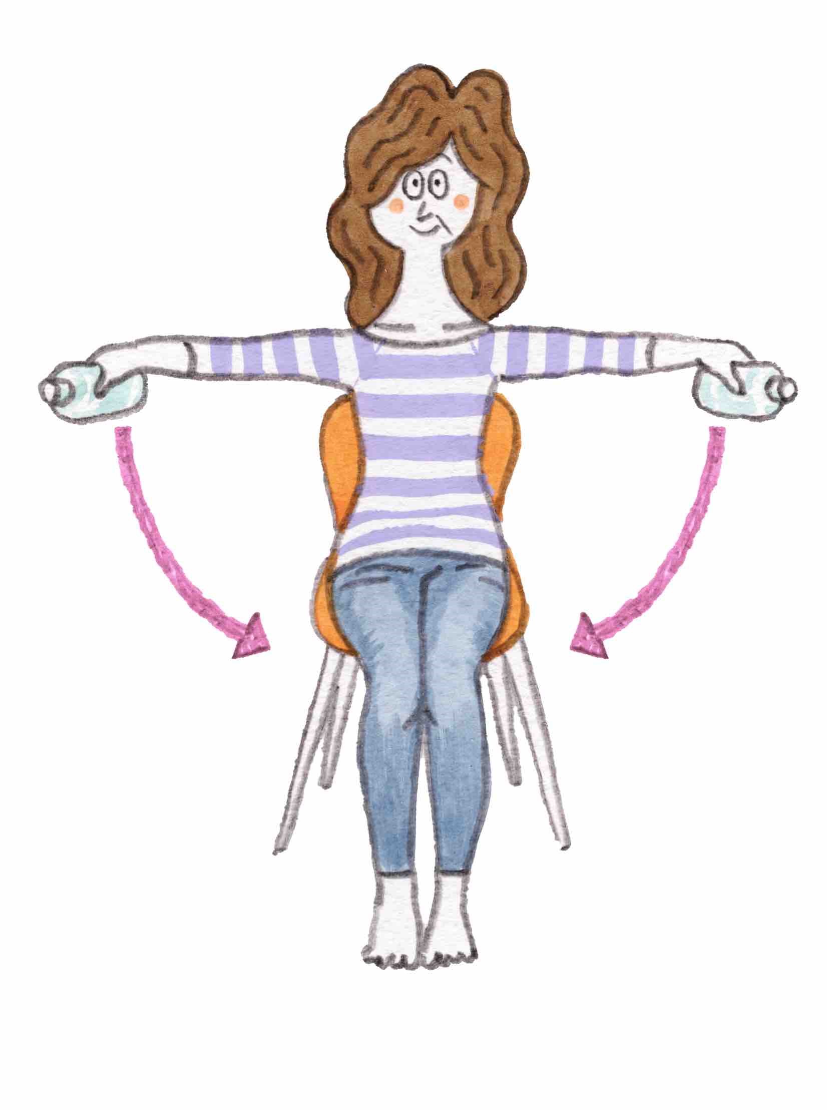 1.5リットルのペットボトルを両手に1本ずつ持ち、椅子に座ります。両腕を伸ばしたまま、真横に肩の高さまで持ち上げ、4秒かけてゆっくり下ろします。10〜20回を目安に2〜3セット行います。