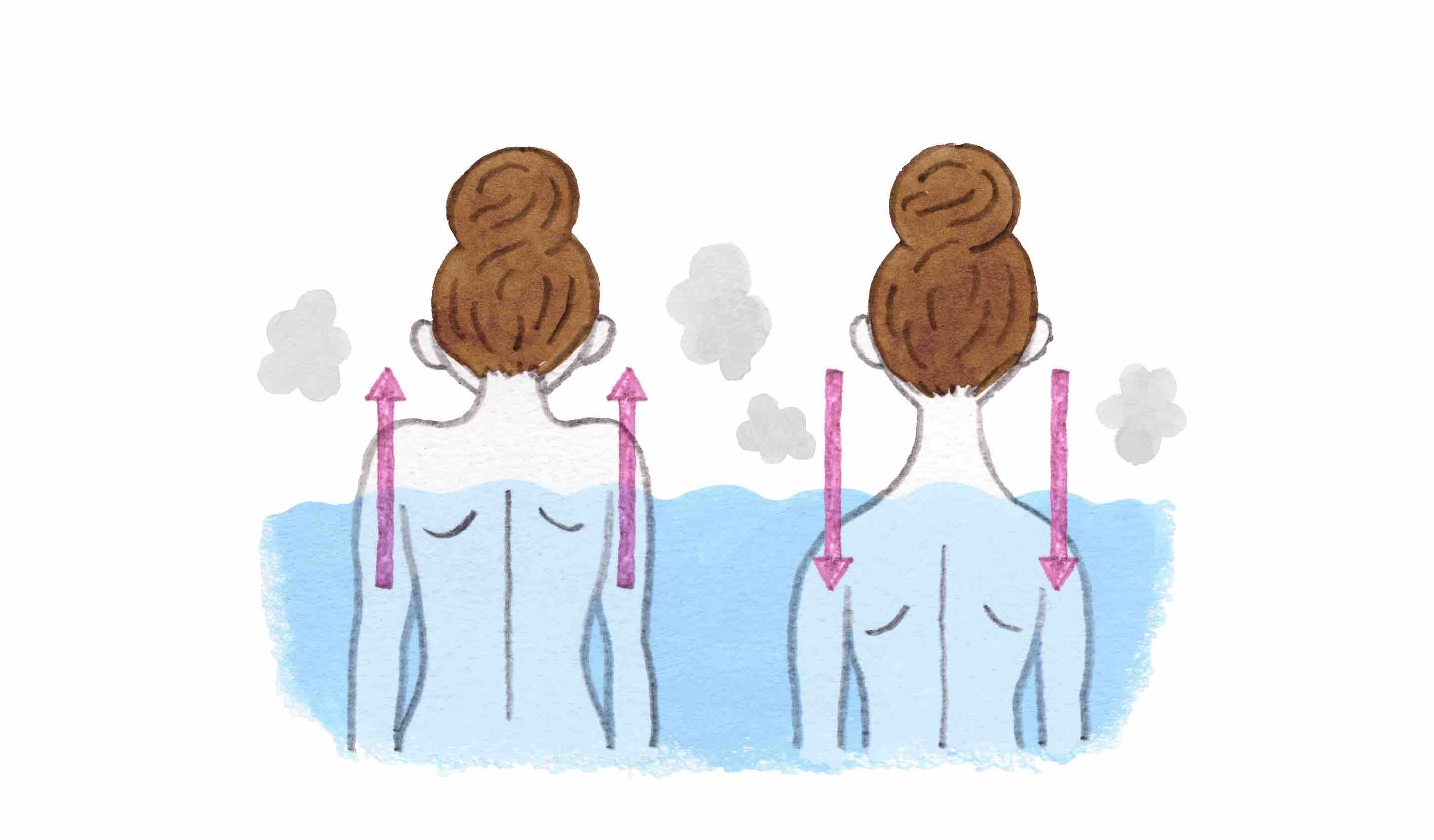 少しぬるめ(約38〜39度)のお湯に、肩までゆったり10分ほど浸かります。その間、肩や首を回して筋肉をほぐしましょう。肩に力を入れてぐっと引き上げ、一気に力を抜く動作を10回程度行うのもおすすめです。